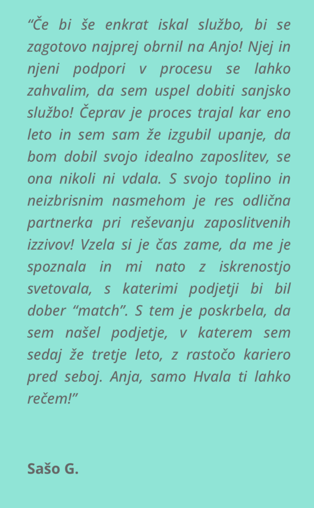 Po letih dela v kadrovskih agencijah, prodaji in marketingu sem končno priznala nekaj, kar sem nosila v sebi že dolgo: ljudje si zaslužijo več kot klasično karierno svetovanje.