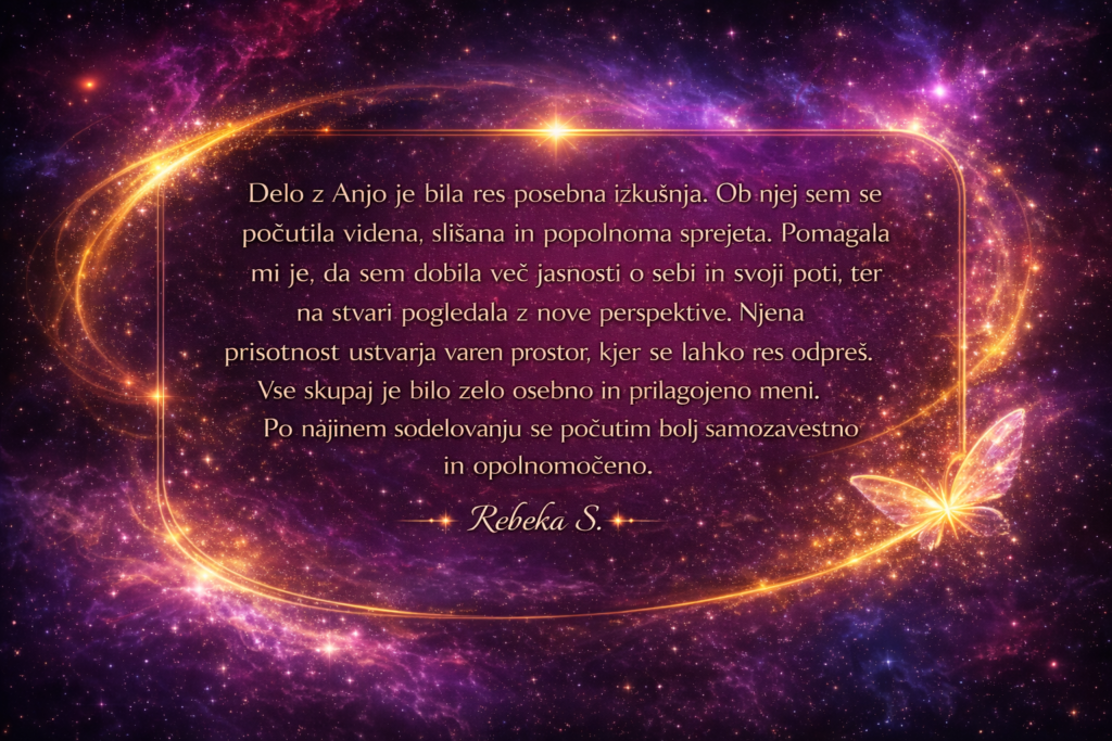 In ja – poskrbim tudi za vse ostale “malenkosti”, ki v resnici niso malenkosti (podpora preko Whatsappa, srečanja se snemajo, tako da so ti na voljo posnetki, s tabo delim intuitivna podporna orodja in na daljavo “držim” energijski prostor za tvojo ekspanzijo.)